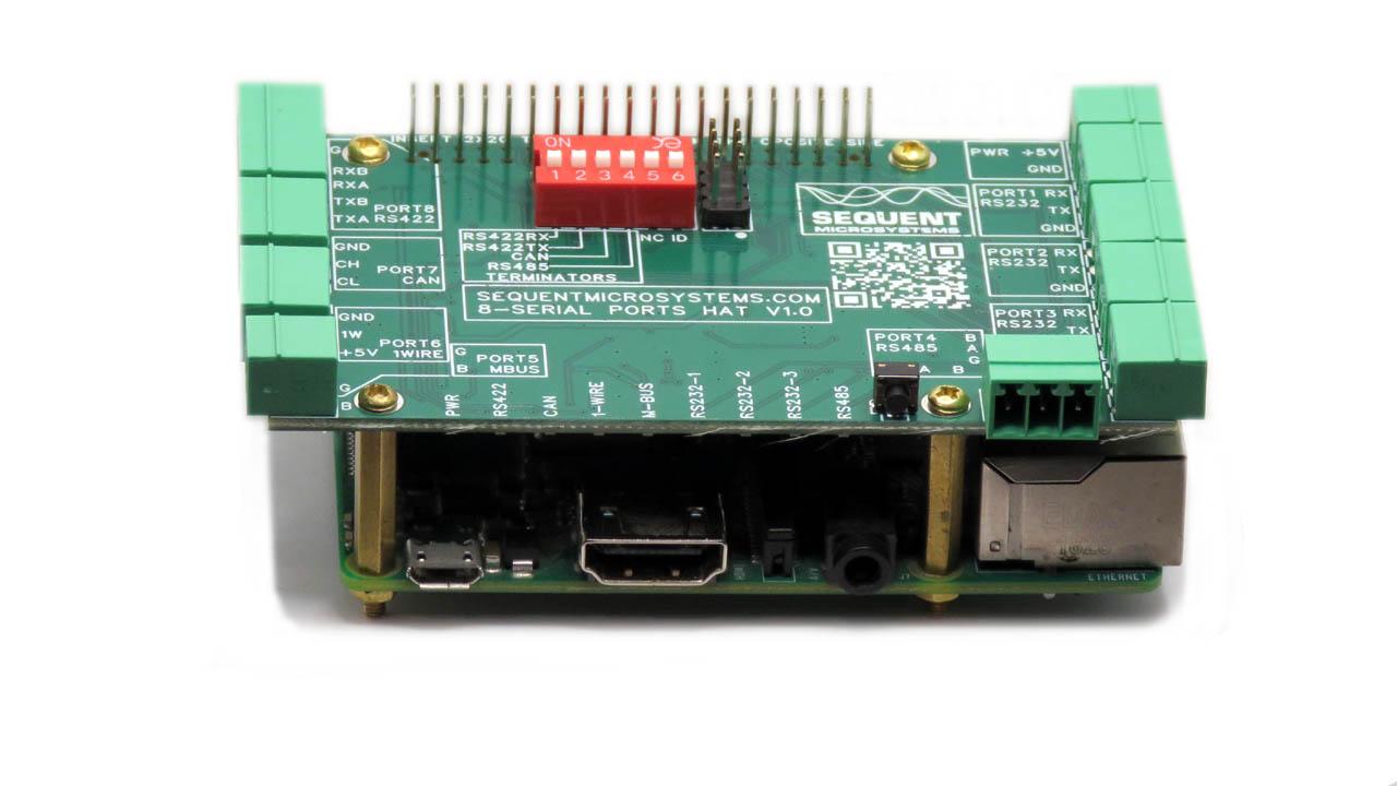 Two Eight Serial Ports HATs can be stacked on top on one Raspberry Pi, implementing a total of 16 serial ports.