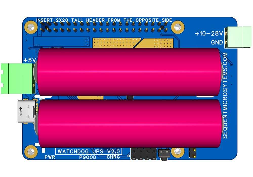 Two 18650 Li-Ion batteries (not provided) can keep the Raspberry Pi running for hours, assuring continuous operation during power outages. When running on battery power, the Watchdog processor monitors the battery voltage. To prevent permanent damage to the battery due to over-discharging, the processor will cut off the power to Raspberry Pi when the battery drops below 2.8V. A software command is available to the user to also monitor the battery voltage. It is strongly recommended that Raspberry Pi performs a self-shutdown and then the battery voltage drops below 3.0V.